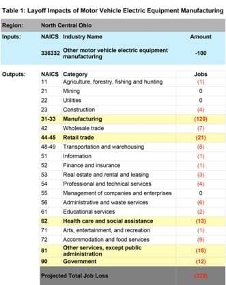 When an employer announces a closure or layoff, the community’s first response should be to assess the total potential impact. It is important to realize that the loss of one company and even a relatively small number of jobs can have a fairly dramatic effect on the community. In Table 1 we have removed 100 jobs from the automotive manufacturing sector (specifically, NAICS 336332: Other motor vehicle electric equipment manufacturing) in one local area to illustrate how a change in that industry affects other parts of the economy.
