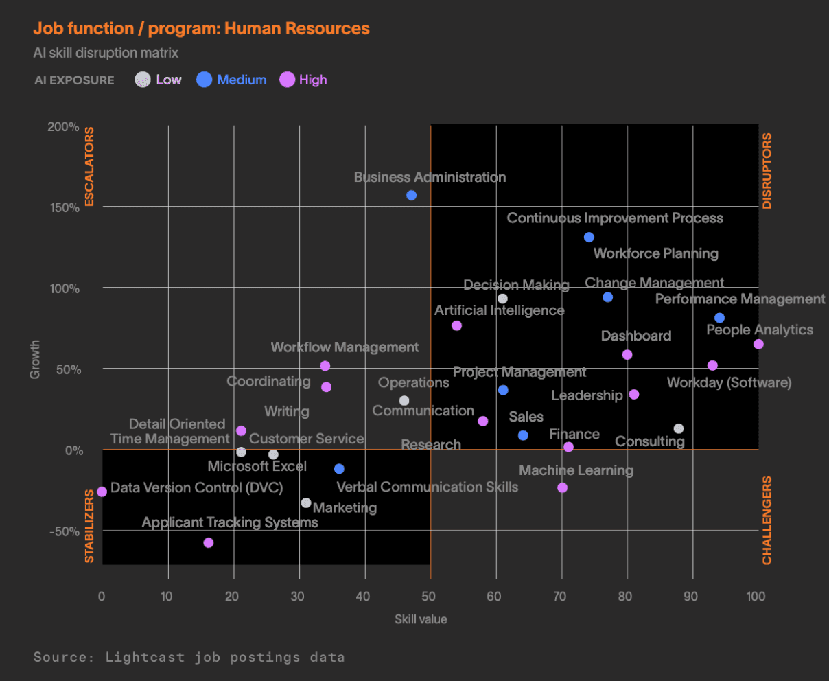 This is where a skills-based perspective becomes particularly powerful. Last summer, in our research Beyond the Buzz, we showed how analysing the skills within jobs can reveal which capabilities are being disrupted by AI and which remain uniquely human. Instead of asking whether a job will disappear, this approach asks a more useful question: which skills within that job are changing, and what does that mean for workers and organisations? We then go a step further, building a Skill Disruption Matrix to help organisations practically start painting a picture of what’s needed today to build for tomorrow (here below you see an example for HR).
