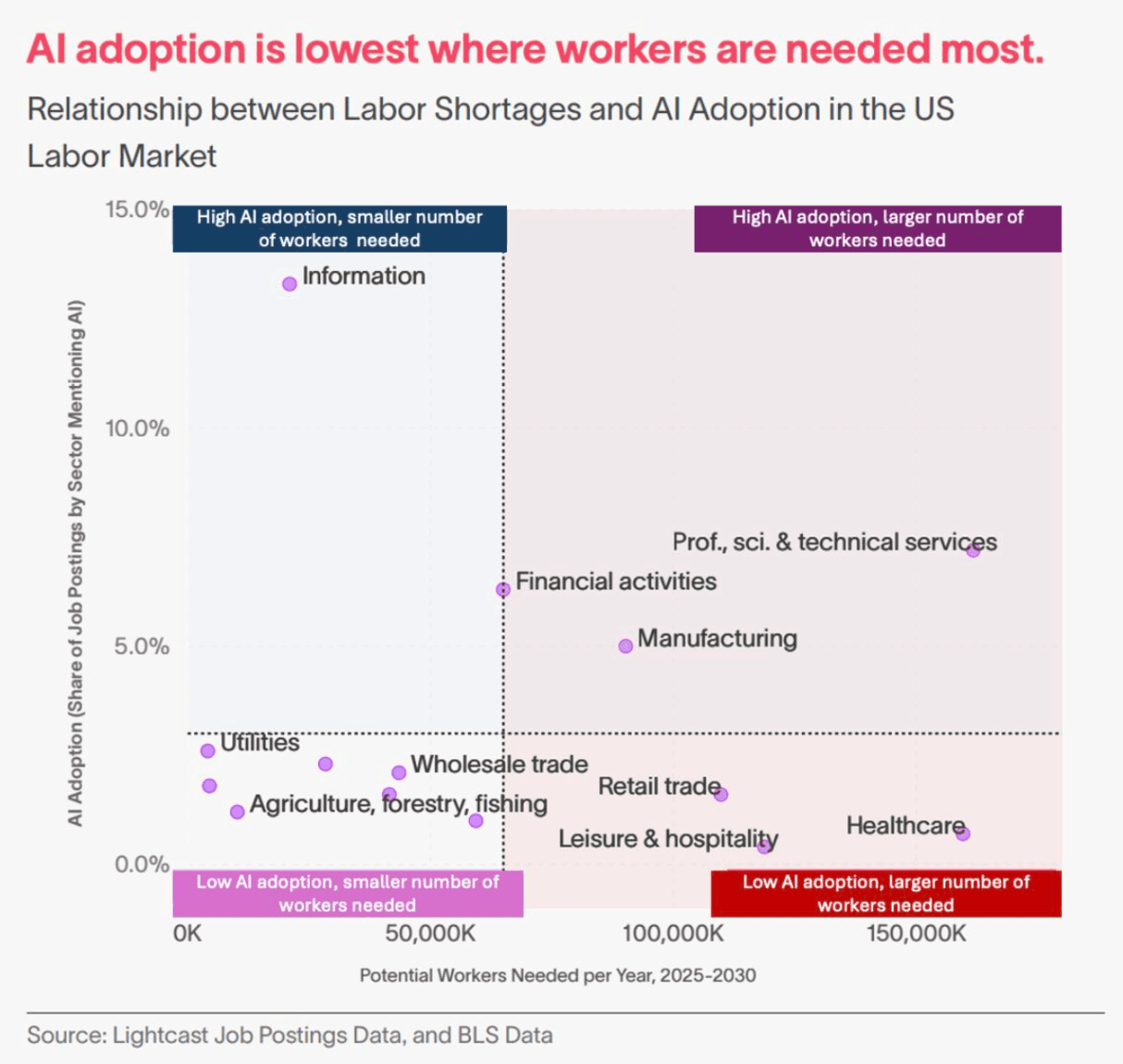 In this context, the role of AI looks very different from the “robots replacing workers” narrative and could potentially help ease some of the sector pressures. AI tools that reduce administrative burden, support diagnostics, or streamline workflows may help clinicians manage growing demand rather than replace them. Yet, as we highlight in the research (see chart below), AI adoption in the healthcare sector is still too low compared to what the sector needs to address its labour shortages.
