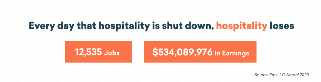 The economic impact of COVID-19 on hospitality (one of the first industries to get slammed) is a tale told only in astronomical numbers. With scant passengers rattling around inside empty airplanes, hotels abandoned, and thousands of weddings—usually considered recession-proof—postponed, hospitality is losing an average of $534 million in earnings and over 12,000 jobs every day.