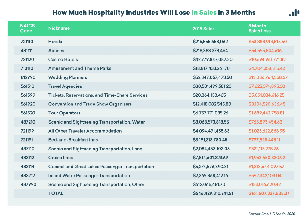 These numbers are based on a projected estimate of the losses hospitality will suffer if they remain shut down for a total of three months (March, April, May), and divided by 92 (days) to find the daily average. By the way, that’s not even counting the food & beverage sub-sector, which we considered separately and is losing $2.8 billion per week.
