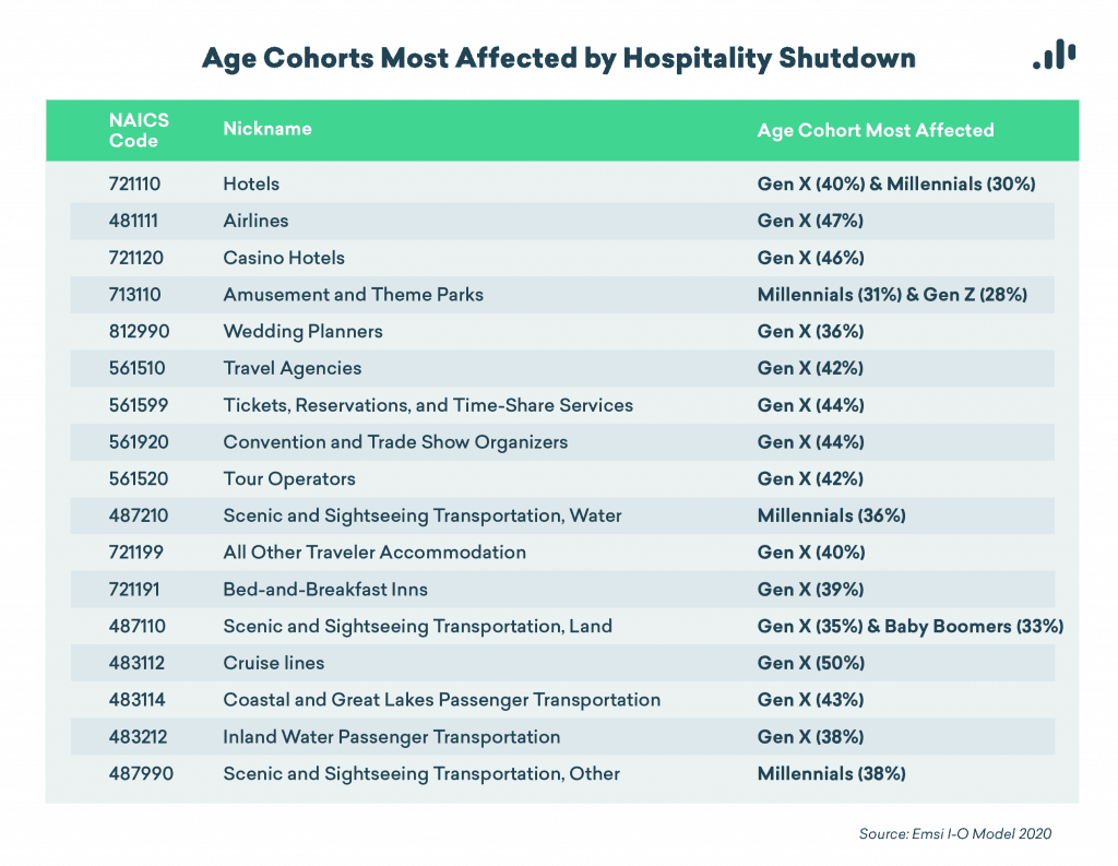 A lot of Gen X workers (and a few upper millennials, too) are getting sucker-punched, since many hospitality jobs employ workers who are ages 45-54. Over the next few months, higher education institutions might well see an influx of nontraditional students as these displaced workers in their 40s and 50s seek retraining and upskilling.