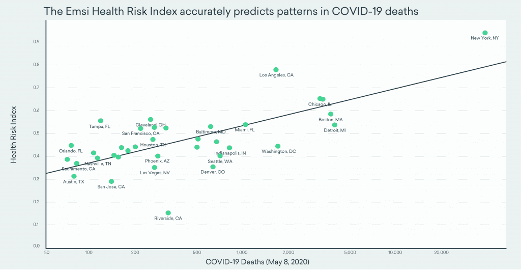 So Emsi combined density, health preconditions, workplace interaction, and overall population health (largely driven by age) to see what the data would reveal. We found that the combination of all four risk factors creates a highly accurate tool for predicting impact in terms of both cases and deaths.