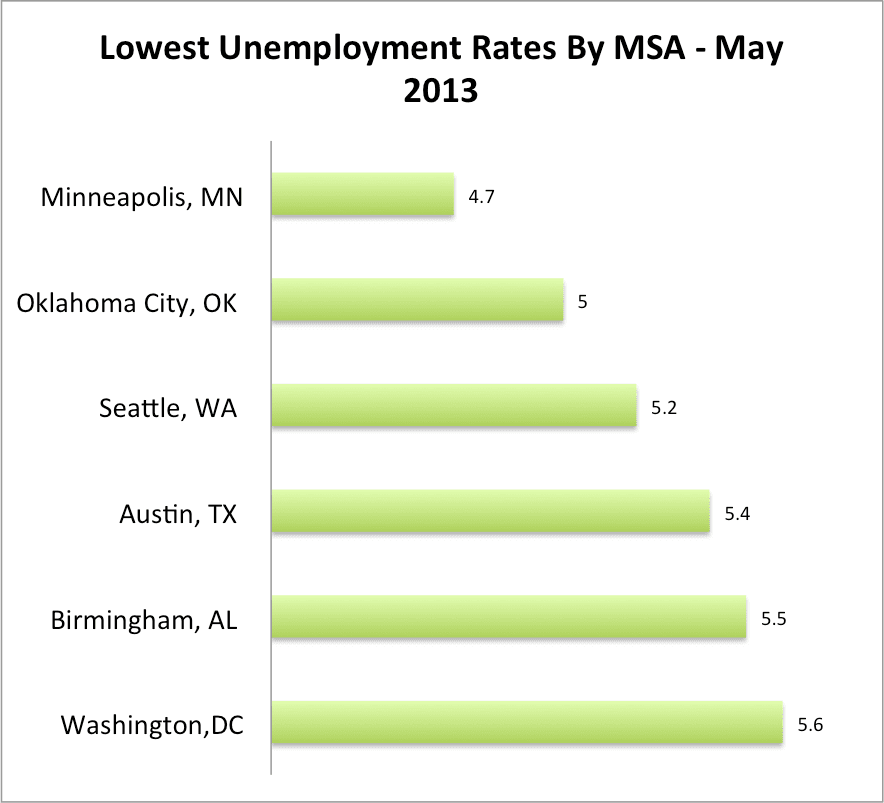 Taking a closer look at the BLS figures linked to in the article, it’s clear that Minneapolis really does have an attractive unemployment rate – just 4.7%, the lowest of the nation’s metros. But while that is the lowest unemployment rate in the country, it doesn’t have an enormous lead on its competition. In fact, there are five other metros with unemployment rates less than a percentage point behind Minneapolis: