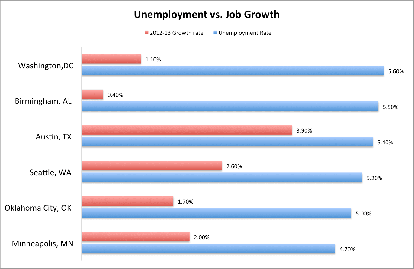 With the competition for the lowest unemployment rate in America that close, it makes sense to take more than just that one factor into account. What’s really interesting is to compare unemployment today with the job growth of the economy over the last year. After all, while unemployment rates are useful, they can’t tell us how many new jobs there are in an area — and those are far more interesting to potential jobseekers than the already-filled jobs that the employment rate describes. Here’s a comparison of 2012-2013 job growth for each of those six metros, compared to the May 2013 unemployment rates: