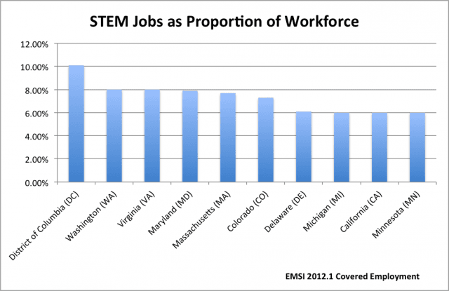 Rank (by Proportion)State2011 STEM JobsProportion of All Jobs2011 STEM Hourly EarningsEarnings Difference (STEM vs. All Jobs)1District of Columbia (DC)72,14310.10%$42.84$9.302 (tie)Washington (WA)238,4178.00%$37.14$15.772 (tie)Virginia (VA)302,2198.00%$38.70$18.024Maryland (MD)202,1007.90%$38.44$15.965Massachusetts (MA)249,9007.70%$38.47$14.906Colorado (CO)167,3477.30%$37.09$16.647Delaware (DE)24,8476.10%$35.13$14.368 (tie)Michigan (MI)231,1486.00%$32.26$12.948 (tie)California (CA)895,4616.00%$38.85$17.068 (tie)Minnesota (MN)157,6816.00%$33.65$13.2111New Jersey (NJ)225,6295.90%$37.93$15.4612 (tie)New Hampshire (NH)35,0695.70%$33.56$13.8112 (tie)Alaska (AK)19,9025.70%$35.46$13.1814New Mexico (NM)45,9085.60%$33.21$15.8715 (tie)Utah (UT)66,0555.50%$29.88$12.2615 (tie)Connecticut (CT)88,9965.50%$35.57$12.8015 (tie)Idaho (ID)34,7255.50%$26.88$10.0418Texas (TX)579,2645.40%$34.35$16.1719Oregon (OR)87,5005.30%$31.16$12.0320Vermont (VT)15,9915.20%$30.08$11.4521Arizona (AZ)123,9945.00%$31.93$13.7522Pennsylvania (PA)273,0384.90%$31.89$13.0423Ohio (OH)242,9134.80%$31.52$13.2524 (tie)North Carolina (NC)184,9584.70%$32.10$14.6324 (tie)Kansas (KS)64,0694.70%$29.65$12.5126 (tie)New York (NY)392,2674.60%$33.93$11.5226 (tie)Illinois (IL)260,7304.60%$33.97$13.6228 (tie)Georgia (GA)171,7474.50%$32.68$14.3828 (tie)Missouri (MO)118,5444.50%$30.83$13.3928 (tie)Wisconsin (WI)120,7044.50%$29.30$11.0728 (tie)Rhode Island (RI)20,7504.50%$34.25$13.9832Montana (MT)19,4474.40%$23.63$7.9533Alabama (AL)79,7004.30%$32.26$15.3234Nebraska (NE)38,7684.10%$28.87$11.9435 (tie)Wyoming (WY)11,6204.00%$26.61$8.4735 (tie)South Carolina (SC)73,4644.00%$29.17$12.4935 (tie)Florida (FL)294,3724.00%$29.53$12.1138 (tie)Indiana (IN)106,4323.90%$28.52$11.2638 (tie)Iowa (IA)57,0663.90%$28.56$11.9040Maine (ME)22,3973.80%$28.67$11.2741Oklahoma (OK)57,1763.60%$28.30$12.3542 (tie)Kentucky (KY)60,9083.40%$27.58$10.9542 (tie)Hawaii (HI)22,1863.40%$31.22$12.4142 (tie)South Dakota (SD)13,8253.40%$23.71$8.6242 (tie)Arkansas (AR)40,0873.40%$26.34$10.7846North Dakota (ND)12,8933.30%$25.21$8.8847 (tie)Tennessee (TN)84,3003.20%$29.19$12.5247 (tie)West Virginia (WV)23,0213.20%$26.24$10.5049Louisiana (LA)59,8483.10%$29.30$12.7650Nevada (NV)32,5482.90%$30.87$12.7951Mississippi (MS)31,6582.80%$26.21$10.92Total6,855,7325.20%$34.07$14.94Source: EMSI Covered Employment - 2012.1