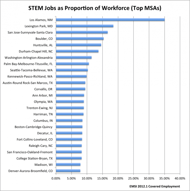Thirty-five percent of the workforce — yes, 35% — in Los Alamos, the site a major national lab, falls under the STEM definition. It’s overwhelmingly the most STEM saturated metro, per capita, in the US.