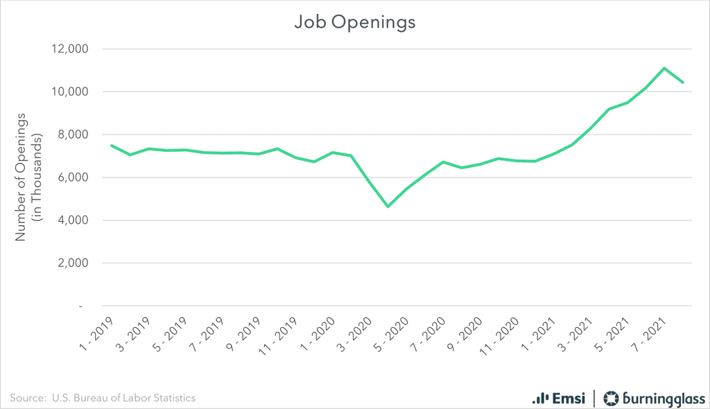 Retail Trade and Transportation, Warehousing and Utilities added the most job openings, with 53,000 and 37,000 new openings respectively. This tracks with what we saw in the Employment Situation Report, when these industries were among the leaders in adding actual new jobs (as opposed to merely job openings).