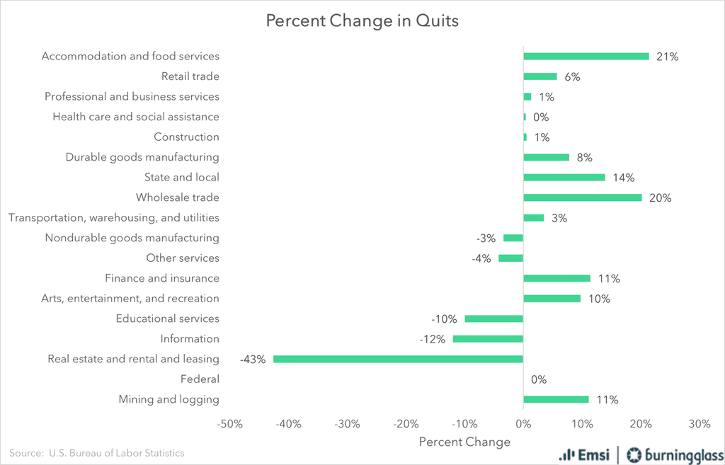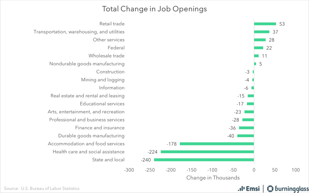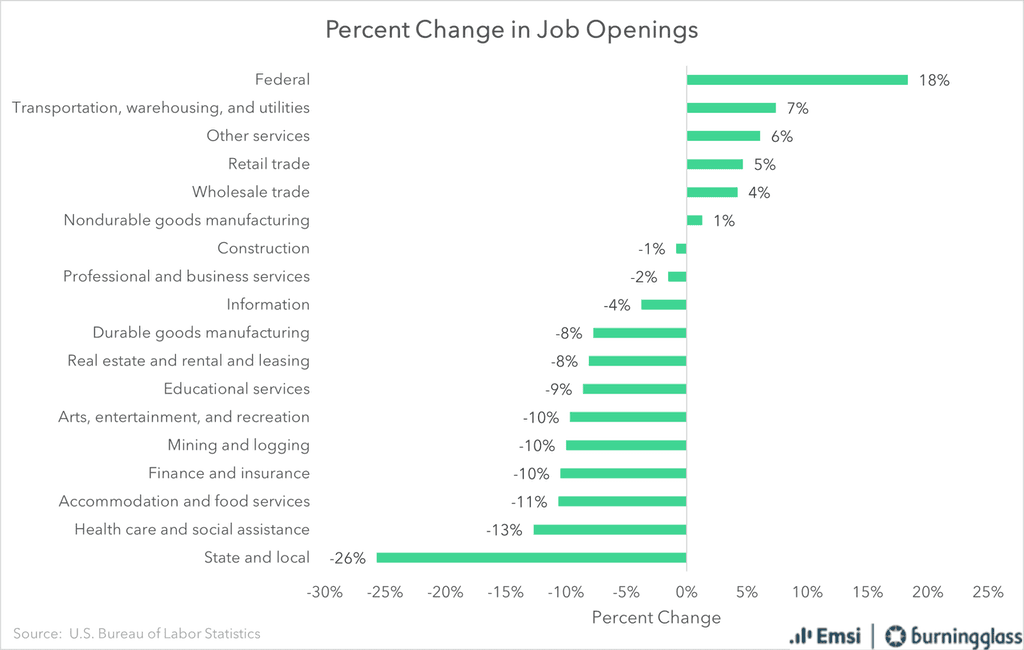 Although State and Local Government saw the biggest loss of any industry (-240,000 job openings, Federal Government actually gained 22,000 job openings. Notably, in terms of percent change, Federal Government was the biggest winner overall.