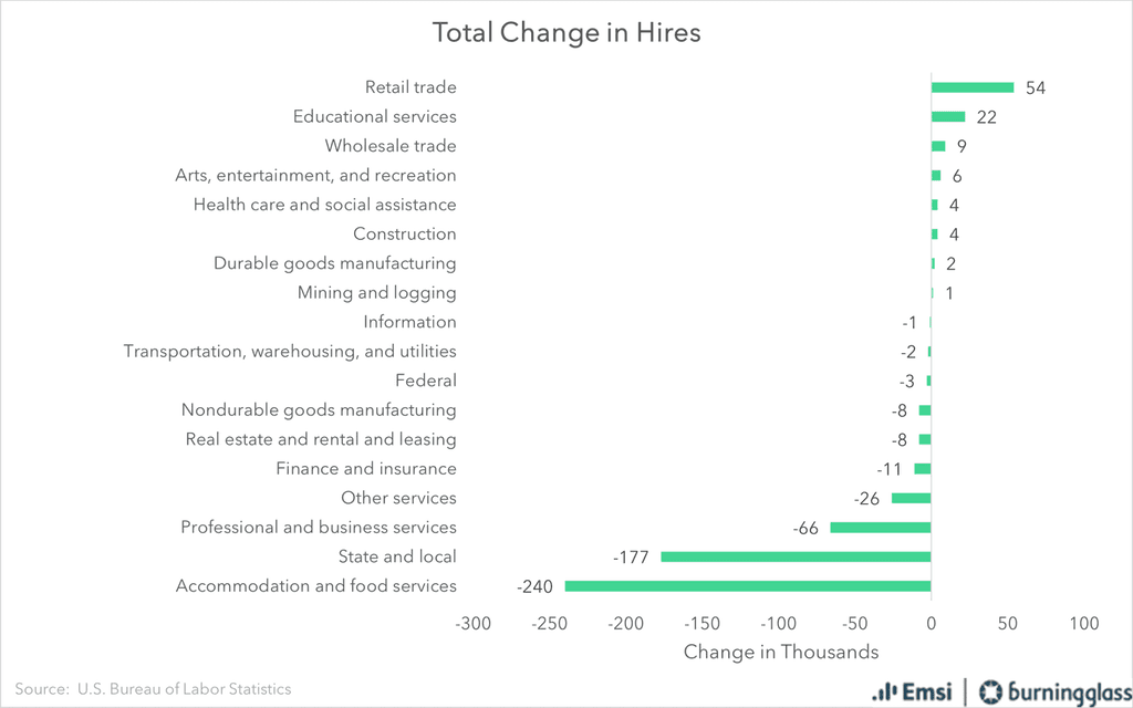 Accommodation and Food Services also saw the steepest drop in actual new hires, with a drop of 240,000.