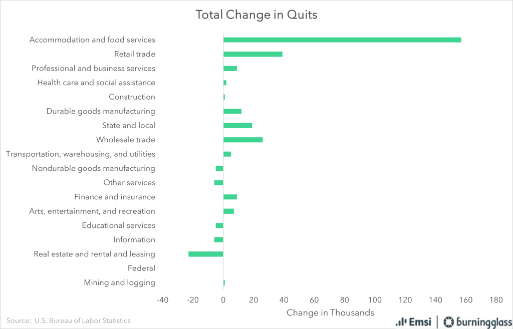 Accommodations and Food services saw the most quits, with 157,000, as well as the highest percentage change.