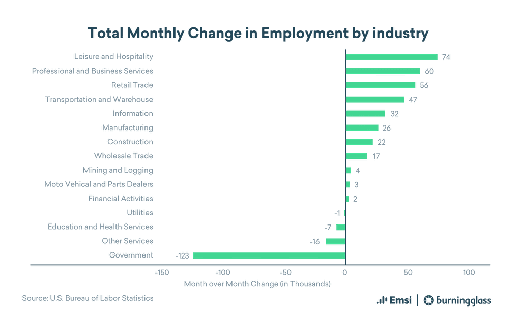 Leisure and Hospitality saw the most growth, with 74,000 added jobs