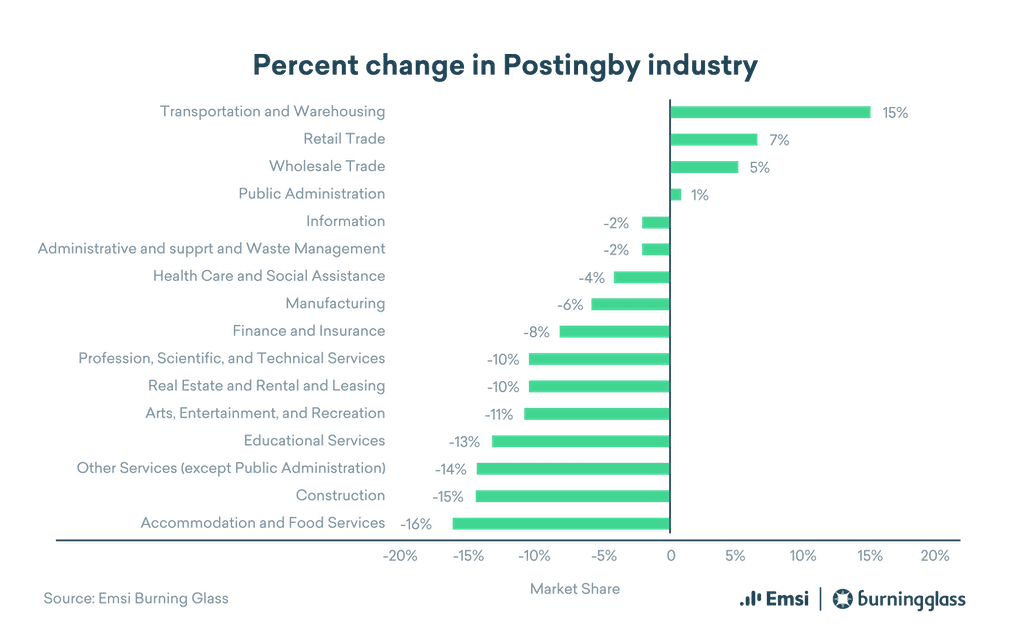 In terms of posting growth, Transportation and Warehousing beat out Professional Business Services and Retail Trade, with a 15% increase in postings.