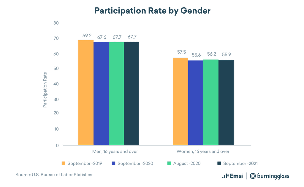 Women, on the other hand, still show no dramatic re-entry into the workforce after the pandemic forced many out. Participation actually fell from 56.2% to 55.9%.