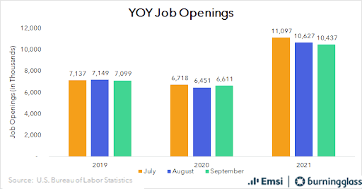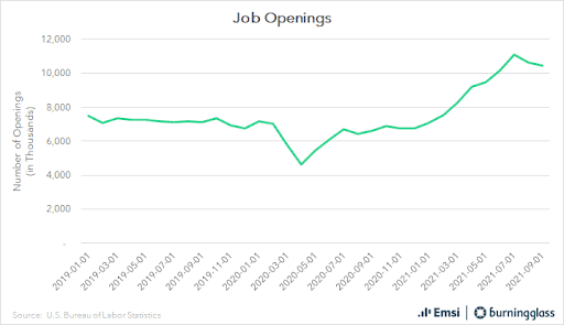 Despite job openings declining slightly for the second month in a row, down to 10.4 million on the last business day of September, they are still much higher than we’ve seen in the past.