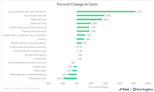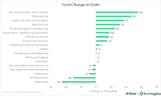 That doesn’t mean that all options are good though. The largest increase in quits (up 56k, a whopping 82%) was in the arts, entertainment and recreation industry, traditionally jobs with lower wages and higher exposure to Covid.