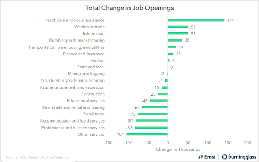 By industry, the largest increases in job openings occurred in health care and social assistance (+141k), wholesale trade (+51k) and information (+51k.