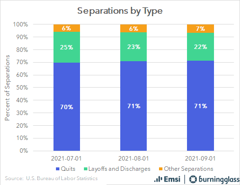 Notably, within separations, the quits rate increased to a new series high of 3.0% and layoffs/discharges constant at 0.9%.