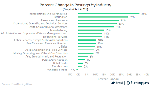 The 36% increase in Transportation and Warehousing postings is good news for anyone trying to find a job fast. But combined with the 12% increase in quits between August and September reported by JOLTS, it means that our supply side difficulties are not going anywhere.