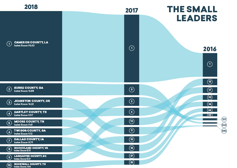 Cameron County, LA, topped the small county rank for the third year in a row. This isn’t surprising since it outranks all other counties with huge job growth (411%) and skilled job growth (529%) and a rise in educated talent and regional competitiveness.