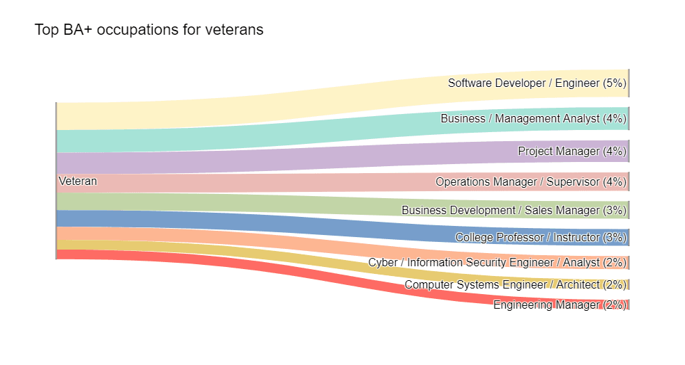 Veterans who graduated from college tend to land high-paying roles. The top occupation is Software Developer, with 5% of all college-educated veterans’ profiles. Business Analyst and Project Manager come in second and third place respectively.