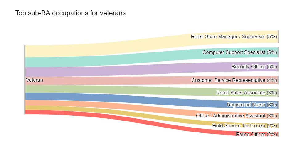 Veterans without a college degree, on the other end, end up in lower-paying occupations. Retail store manager appears in 5% of the all sub-bachelor’s degree veteran profiles, as does Computer Support Specialist and Security Officer.