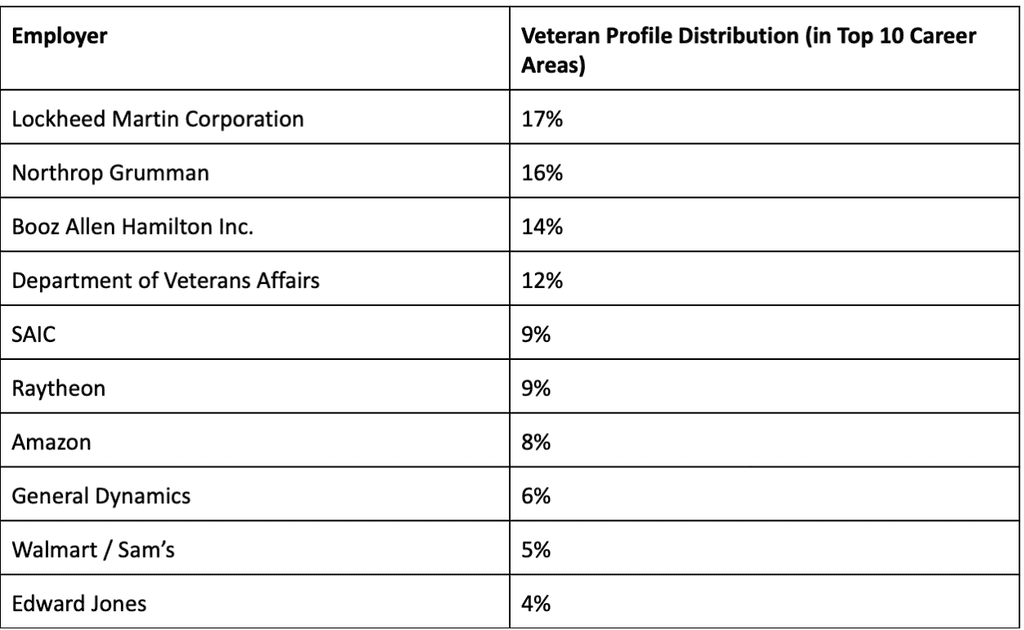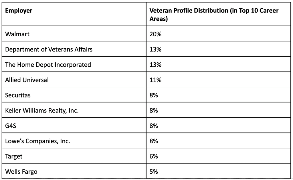 While veterans with degrees are analyzing and managing entire companies, those without are managing individual stores. The distinction appears equally sharp when we look at top employers.