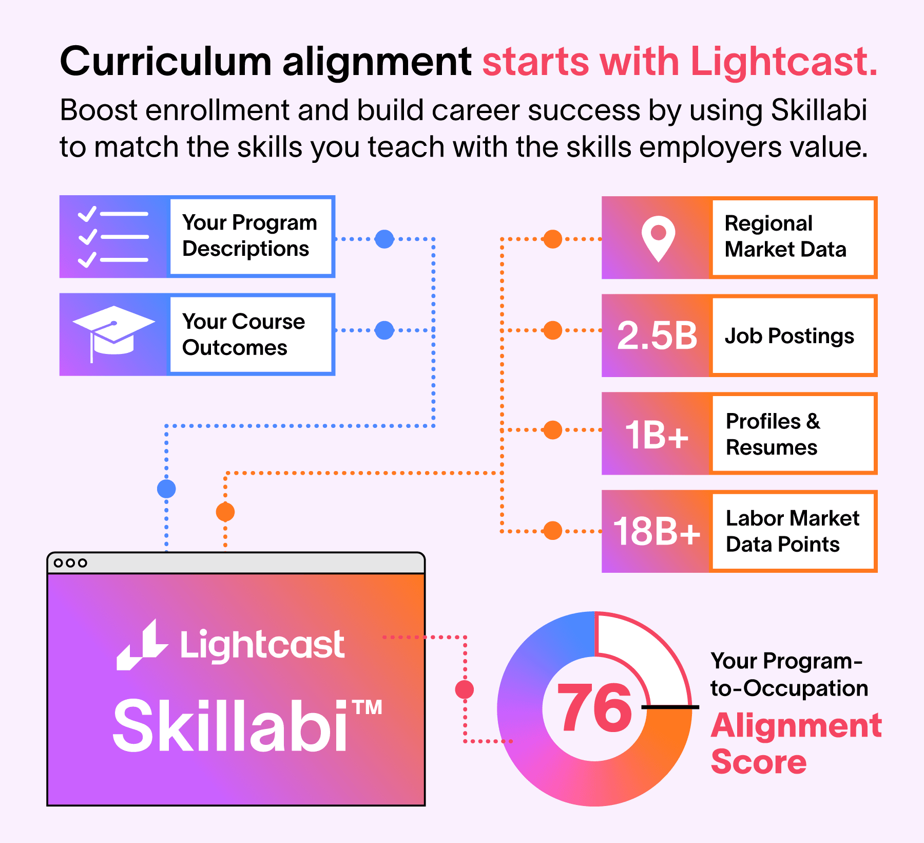 Skillabi connects your program content to real-time labor market insight, producing a unique Program-to-Occupation Alignment Score for each of your academic programs. Identify skill gaps, discover market opportunities, and gain actionable intelligence to ensure your institution stays competitive, and equips learners for success in a rapidly changing economy.